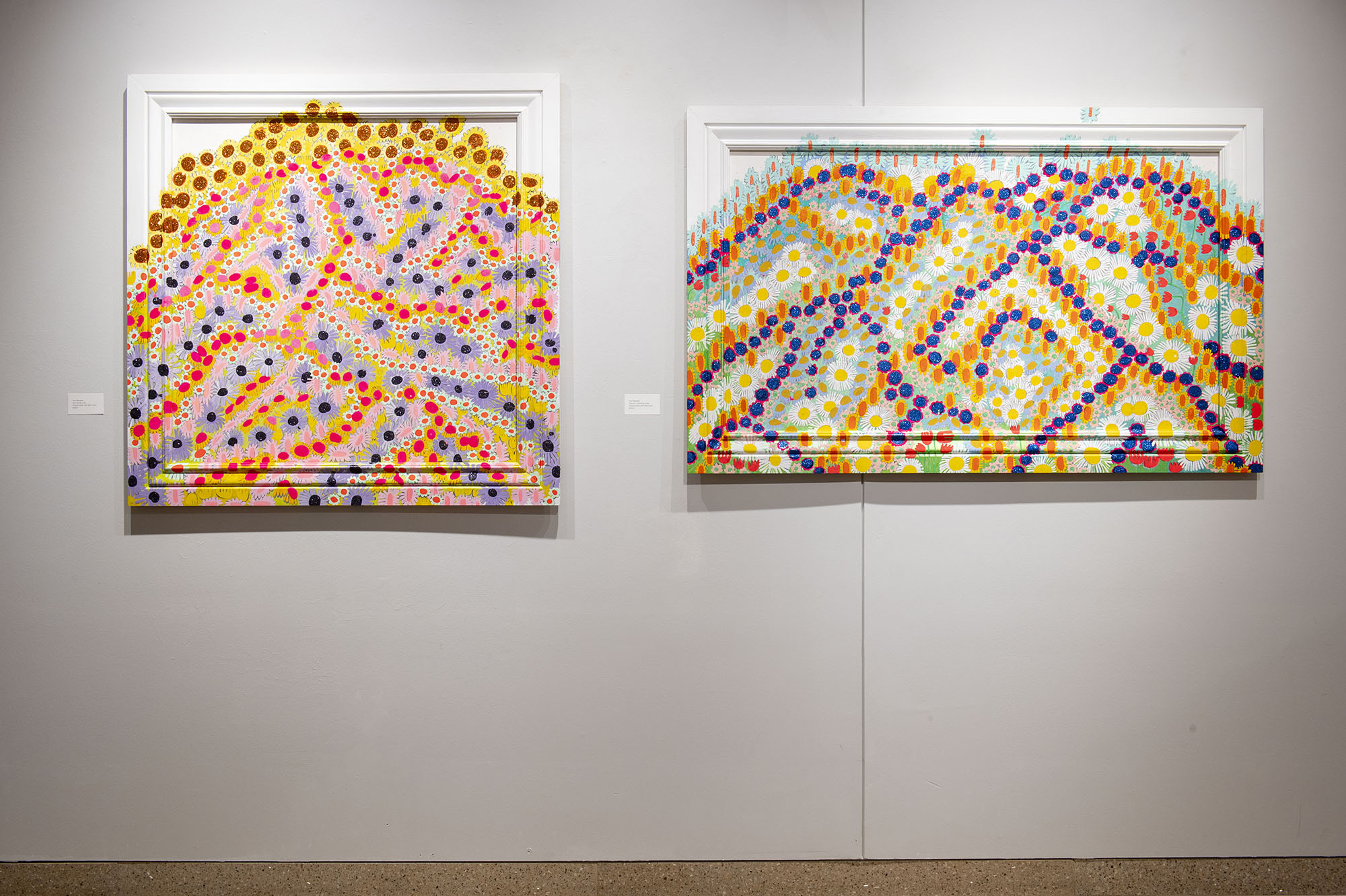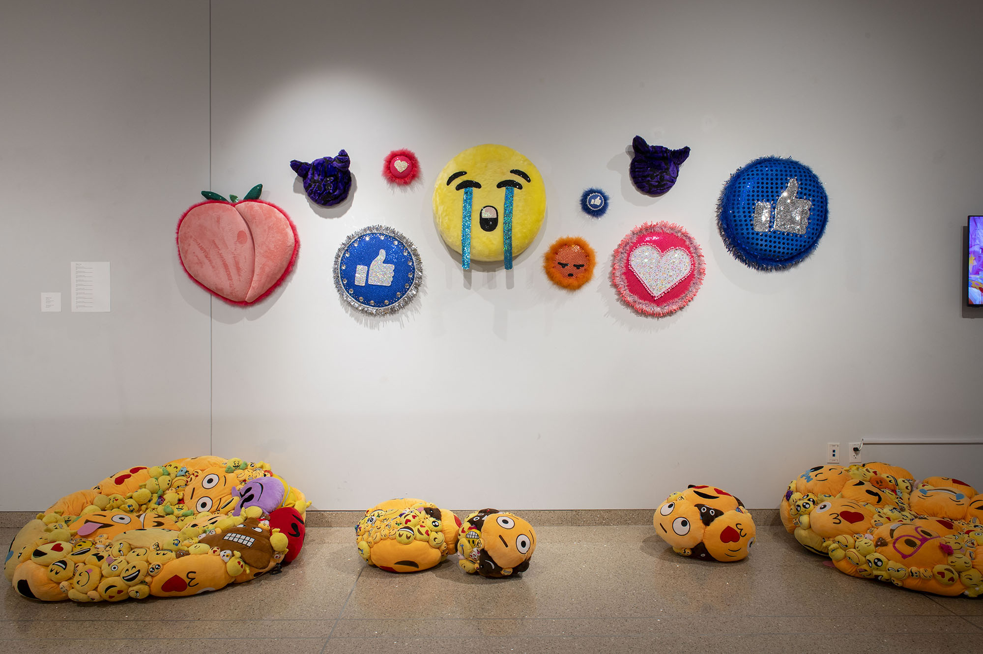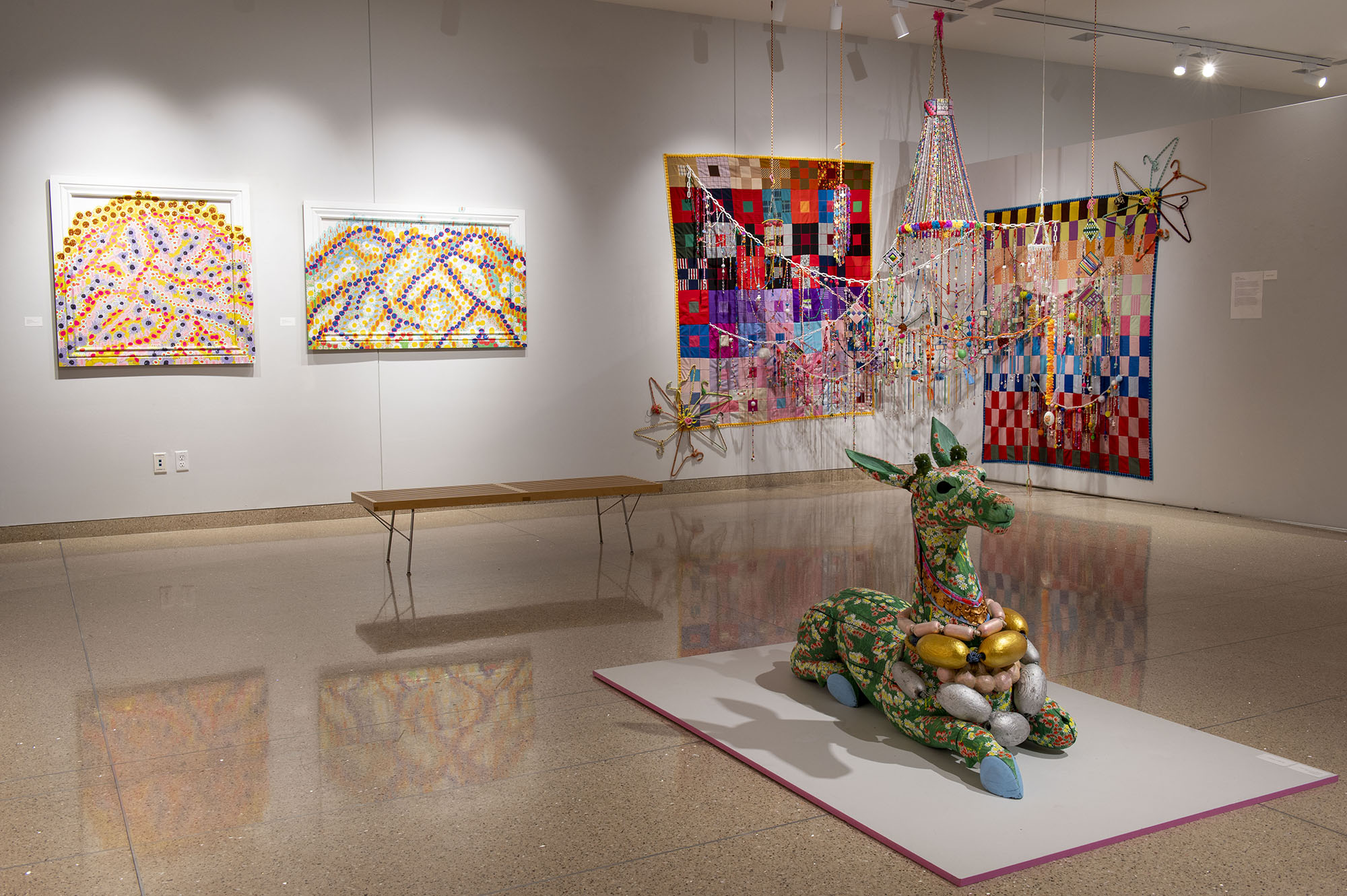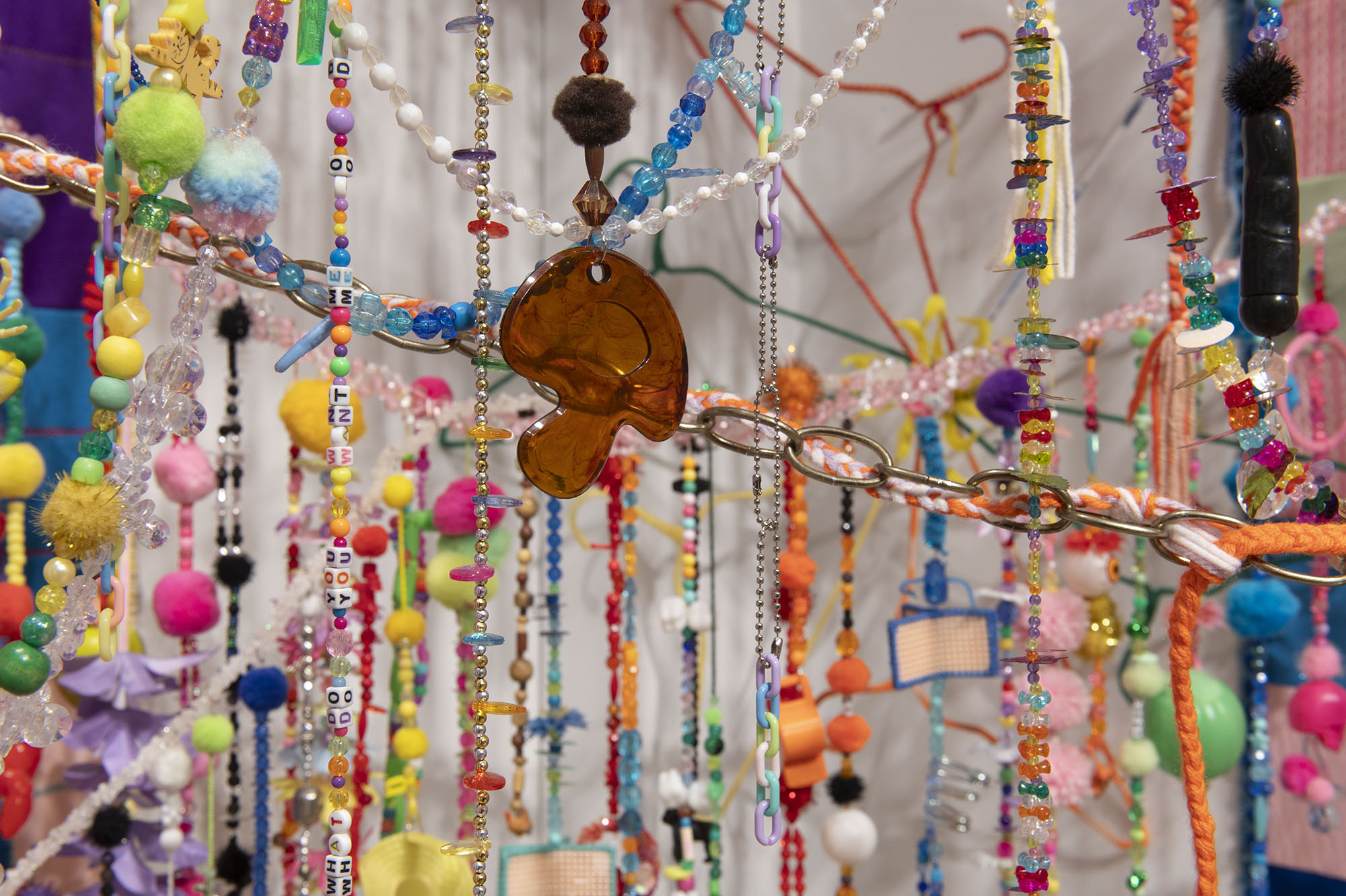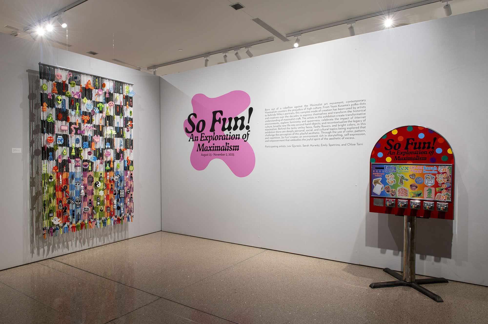 Born out of a rebellion against the Minimalist art movement, contemporary Maximalism counters the prejudice of high culture. From Yayoi Kusama’s polka dots to Kehinde Wiley’s portraits, this complex mode of creation has been used by artists and creatives over the decades to express themselves and transform the historical understanding of maximalist craft. The artists in this exhibition create transformative environments, explore femininity and queerness, celebrate the impact of internet culture, breathe new life into second-hand objects, and recontextualize the legacy of maximalism. Behind the tacky smiley faces, flashy flowers, and bright colors, in this exhibition there are deeply personal, social, and cultural topics being explored that challenge the perception of this playful aesthetic. Through the use of color, pattern, and repetition, “So Fun!” creates an environment rich in storytelling, self-expression, and empowerment that embodies the joyful spirit of the aesthetic of excess.